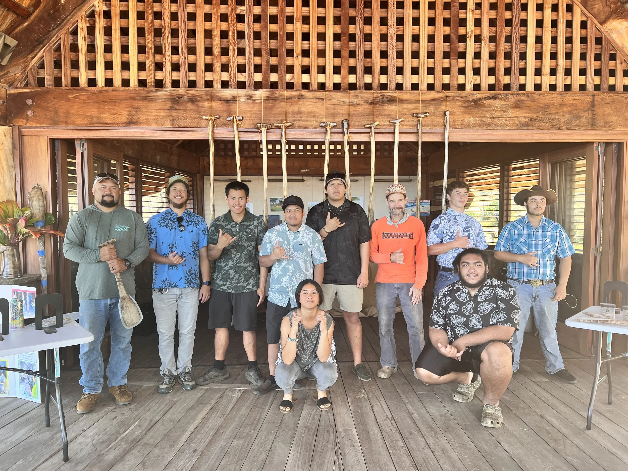 Naʻau ʻŌiwi students and partners following a presentation of how they utilized harvested invasive sisal from Māhukona to make canoe paddles.