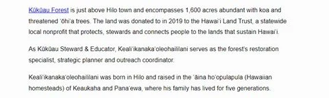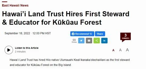 BIG ISLAND NOW - Hawaiʻi Land Trust Hires First Steward & Educator of Kūkūau Forest Sep 19 Written By Madi Masek Read the article at BigIslandNow.com Read a similar article by Hawaiʻi Tribune Herald Madi Masek