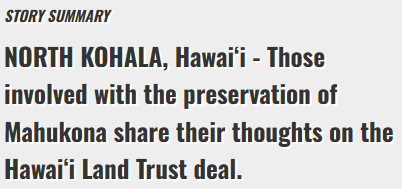 BIG ISLAND VIDEO NEWS: Reactions To Mahukona Purchase Announcement Dec 14 Written By Madi Masek Read the article at Big Island Video News Madi Masek