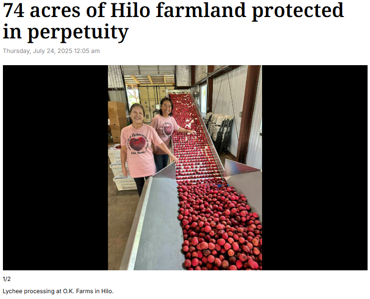 HAWAII TRIBUNE HERALD: 74 acres of Hilo farmland protected in perpetuity Jul 24 Written By Madi Masek Read the article at Hawaii Tribune Herald Madi Masek