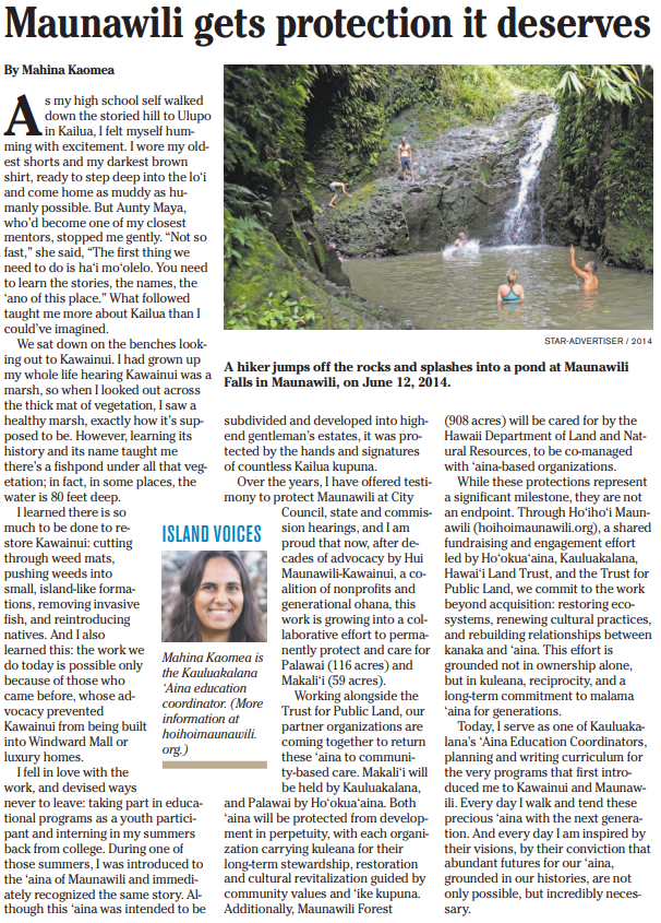 HONOLULU STAR-ADVERTISER: Maunawili gets protection it deserves Feb 1 Written By Madi Masek Read the article at Honolulu Star-Advertiser Madi Masek
