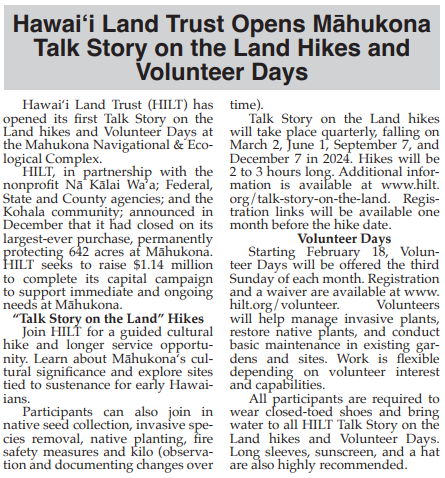 KOHALA MOUNTAIN NEWS: HILT Opens Mahukona Talk Story on the Land Hikes and Volunteer Days Jan 25 Written By Madi Masek Read the article at Kohala Mountain News Madi Masek