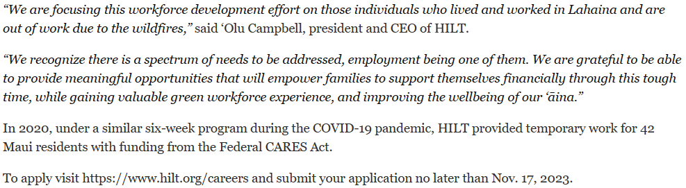 LAHAINA NEWS: Hawai‘i Land Trust offers workforce opportunities for wildfire-affected residents Oct 20 Written By Madi Masek Read the article at Lahaina News Madi Masek