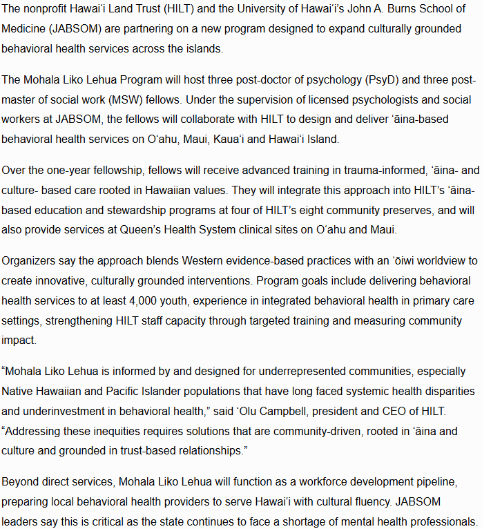 MAUI NOW: Hawai‘i Land Trust, JABSOM launch program to expand ‘āina-based behavioral health services statewide Sep 18 Written By Madi Masek Read the article at Maui Now Madi Masek