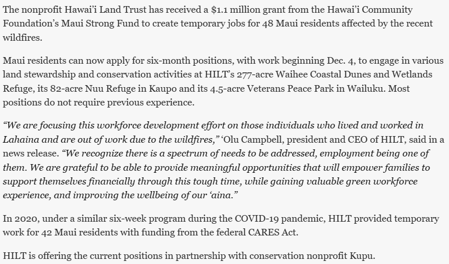 THE MAUI NEWS: Nonprofit gets $1M to create jobs for residents impacted by fires Oct 21 Written By Madi Masek Read the article at The Maui News Madi Masek